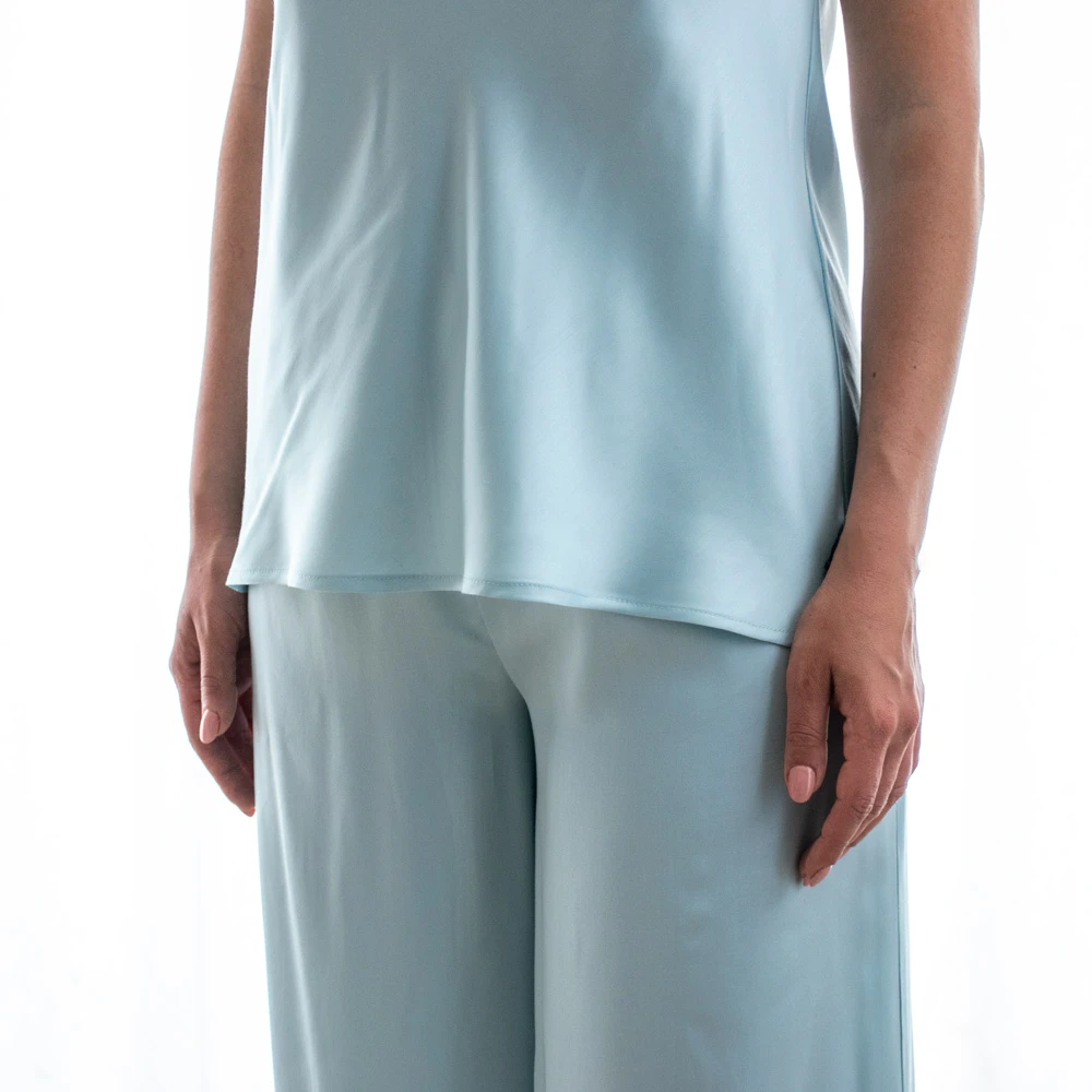 Pantalone vita alta, gamba ampia, con elastico in vita.