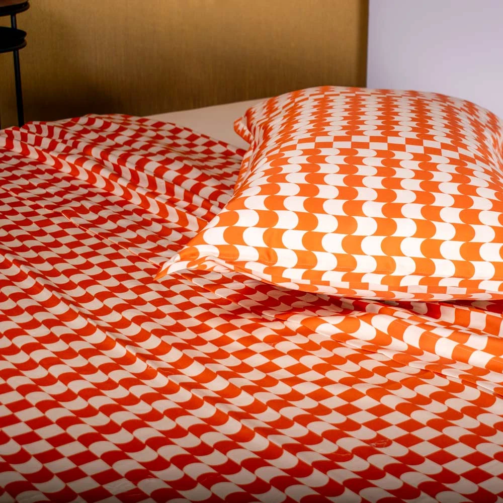 Le federe Twiggy sono un vero e proprio manifesto di stile, con stampe geometriche ipnotiche e un gioco di colori vivaci che evoca l'energia della Pop Art e delle discoteche anni '70. Il pattern a scacchiera irregolare e ondulato che vedi nell'immagine, in un brillante arancione e champagne, è emblematico di quel periodo, portando una ventata di allegria e originalità. Ma l'estetica non è tutto: la vera magia risiede nella materia. Ogni set è confezionato con il pregiatissimo raso di puro cotone TC300, un tessuto che accarezza la pelle con una morbidezza setosa e una lucentezza raffinata, assicurando un comfort di altissimo livello per le tue notti.