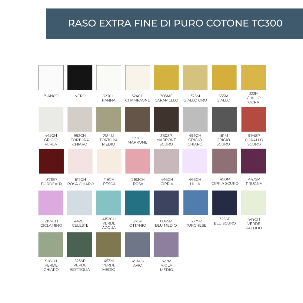 Il Cotone Extrafine è il cotone classico e semplice, facile da stirare e resistente. Il Raso Extrafine di Puro Cotone, invece, è contraddistinto da una diversa trama nell’intreccio del tessuto e da un trattamento detto “a tamburo”, ovvero una stiratura ad altissime temperature che lo rende lucido alla vista e soffice al tatto.